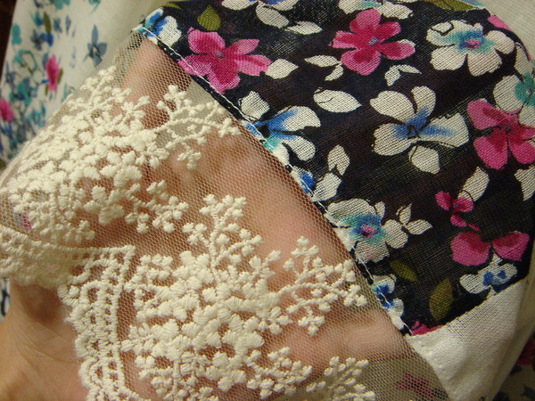 散狀裙擺上,佈滿桃紅又藍綠的小花
